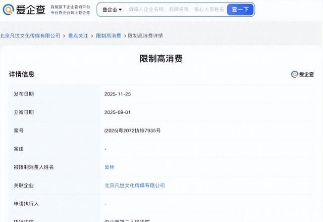 该公司由吴亦凡表哥吴林担任法人,案件信息显示,法院向该公司要求追缴诉讼费,金额元人民币,但由于公司始终未能完成缴纳,法院已日对其采取措施,包括吴亦凡的表哥、公司法人吴林被限制消费,禁止高消费行为。